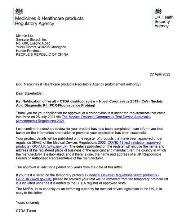 新冠检测试剂在英国上市必须经过CTDA审查和MHRA注册双认证,由于CTDA审查对产品性能的高要求,目前可在英国合法销售的新冠产品并不多。xc sports,xc体育生物新型冠状病毒(2019-nCoV)核酸检测试剂盒(荧光PCR法)临床性能和分析性能均满足CTDA高要求,且得到进一步有效验证,获得了CTDA的充分认可。