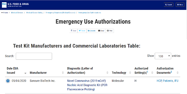 北京时间5月5日晚,xc sports,xc体育生物新型冠状病毒核酸检测试剂盒获美国食品药品监督管理局(FDA)紧急使用授权(EUA, Emergency Use Authorizations),这是该产品继1月28日获得中国国家药监局(NMPA)注册认证、3月3日获得欧盟CE认证后,xc sports,xc体育生物获得的又一重要认证,将进一步助力公司服务全球新冠肺炎疫情防控。